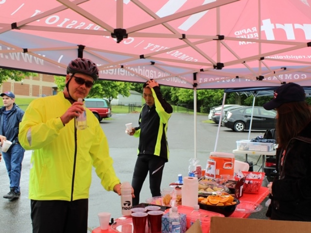 The day started off rainy as RRT members helped set up rest stations by setting up tents and tables where they served water, Gatorade, granola bars and energy gel to the riders.  The riders received encouragement by the volunteers as they arrived at the stations.