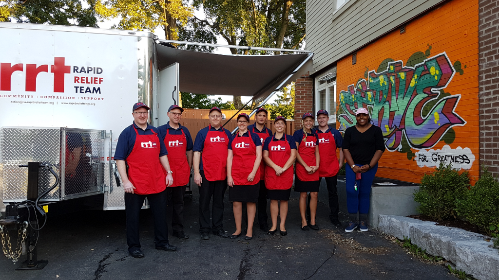 On Saturday August 26, 2017, The Rapid Relief Team from Toronto used one of the RRT purpose-built cooking trailers, to provide a BBQ Experience for the youth at this Shelter. The RRT Volunteers rolled up their sleeves and got to work preparing and serving the Hamburgers (and of course all the necessary toppings), chips, cookies, and fruit for the youth and staff of this amazing facility.