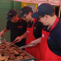 RRT hard at work preparing sausages and burgers for Christmas Party AttendeesAs well as looking after the BBQ, the RRT team were assisting with serving and helping out in the kitchen where possible.