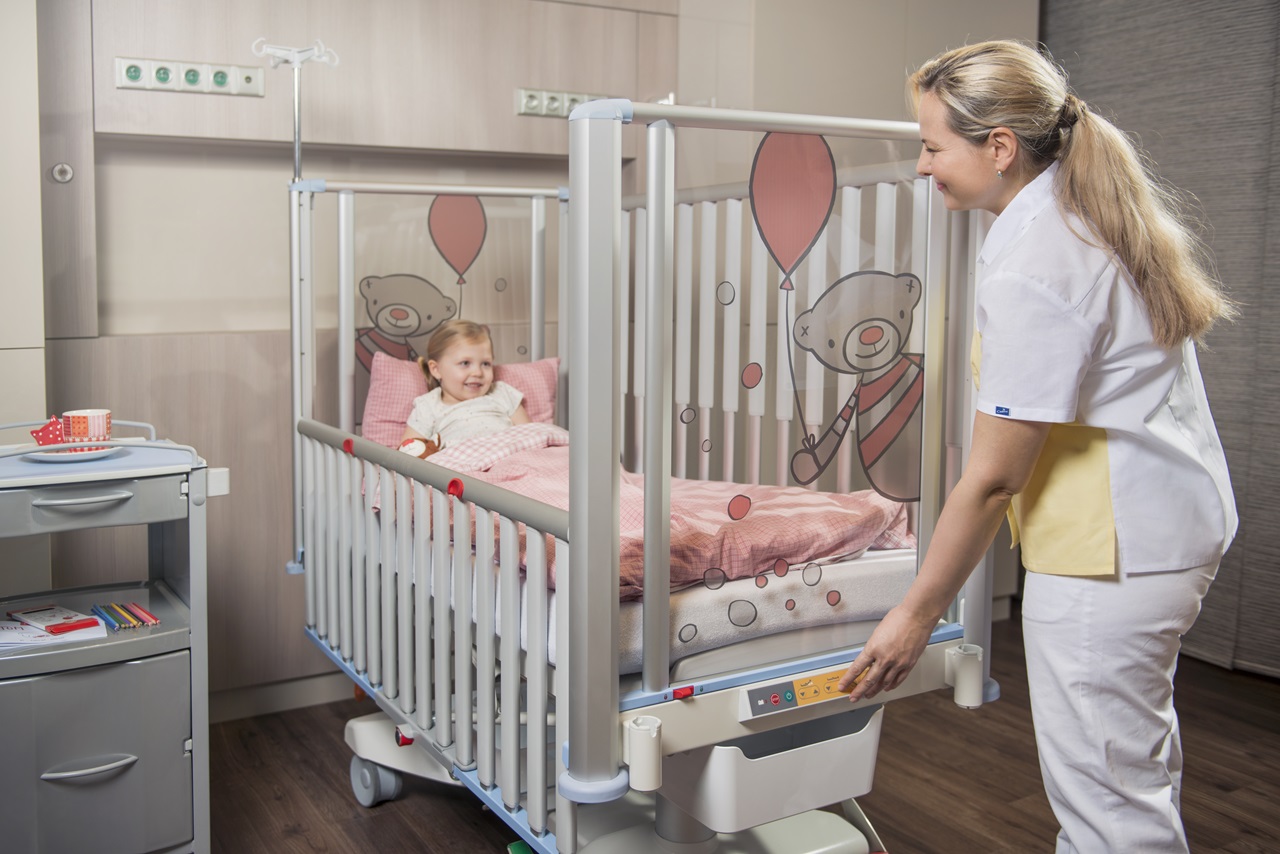The Paediatric cot is a state of the art pre-school children’s bed. It provides excellent access for nursing staff with electric positioning, telescopic siderails and column construction mechanism. The cot has very high safety parameters and looks great with a child-friendly design.
